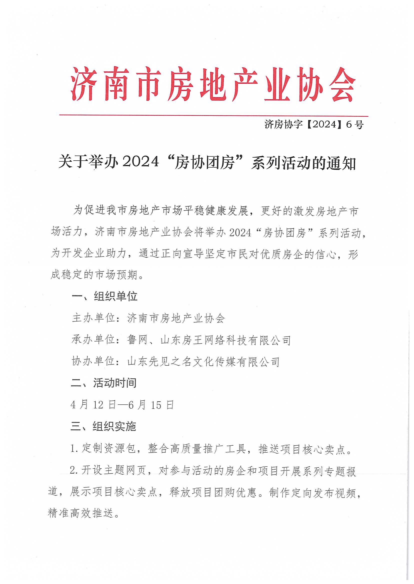 鲁网4月12日讯 为促进济南市房地产市场平稳健康发展,更好的激发房地产市场活力,济南市房地产业协会将举办2024“房协团房”系列活动,为开发企业助力,通过正向宣导坚定市民对优质房企的信心,形成稳定的市场预期。