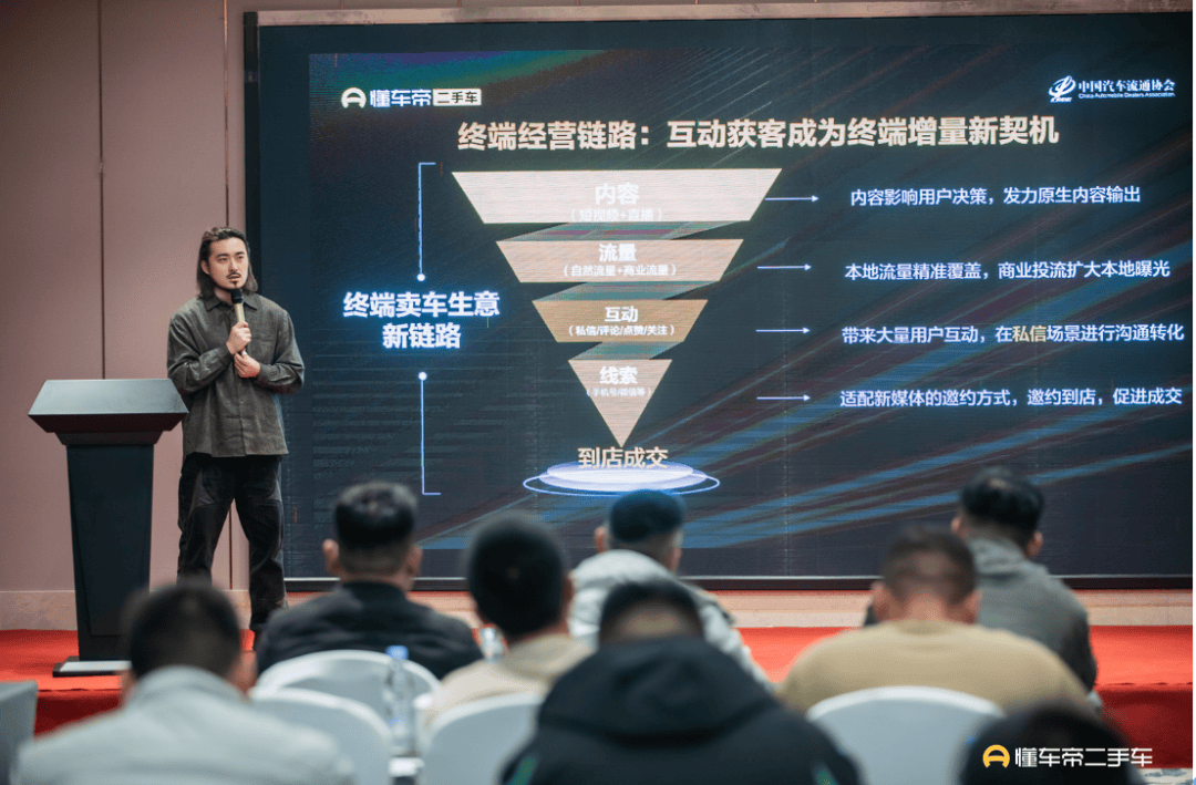 懂车帝二手车新媒体培训师杨勃围绕“内容、流量、互动、线索、到店成交”全运营流程分享经验,并就二手车商家如何在异军突起的短视频领域抓住风口、打造优质的内容以及强化二手车视频传播平台差异化效果做出了精彩的分享。他指出,精细化的新媒体运营能够帮助商家创作出对用户更有价值的内容,使车源和内容形成良性互动,获得更大的收益。
