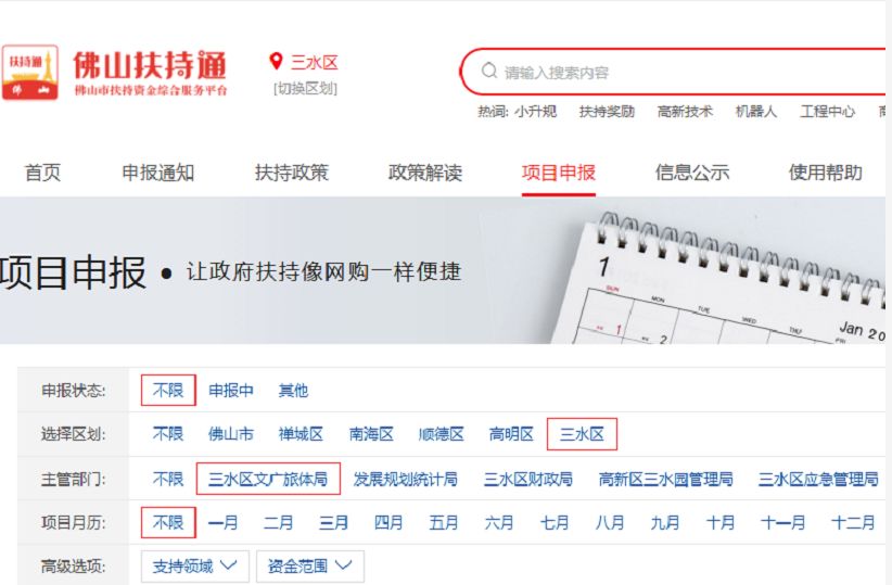 进入【项目申报】——选择申报状态【不限】,选择区划【三水区】,主管部门【三水区文广旅体局】,项目月历【不限】,即可看到文化类、旅游类、体育类共3个申报类别。