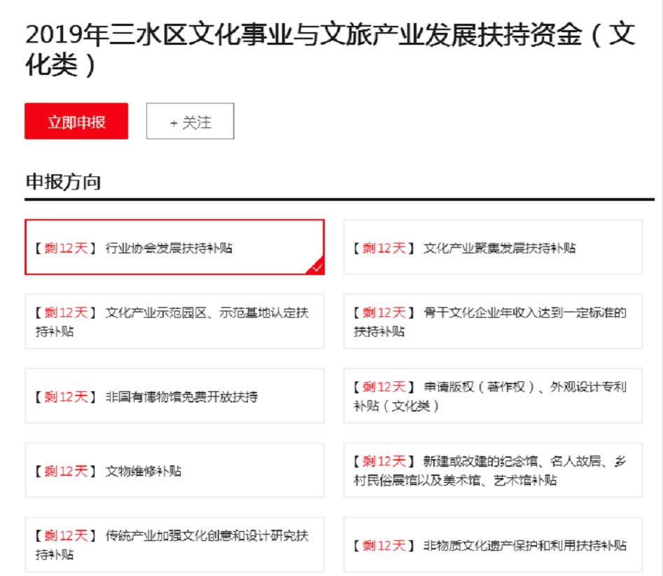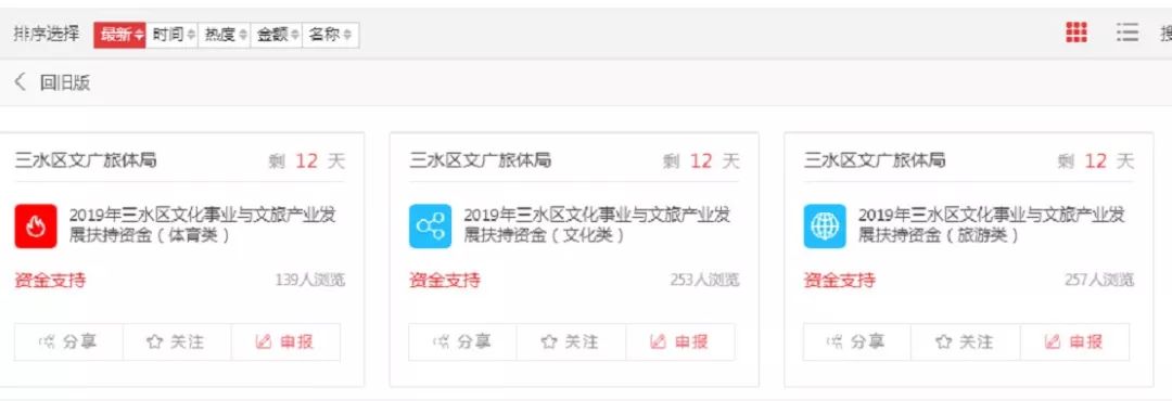2.网络平台填报。平台上选择“2019年三水区文化事业与文旅产业发展扶持资金(文化类)”或“2019年三水区文化事业与文旅产业发展扶持资金(旅游类)”或“2019年三水区文化事业与文旅产业发展扶持资金(体育类)”项,并按要求填写申请表,上传相关申报材料,确认无误后提交;