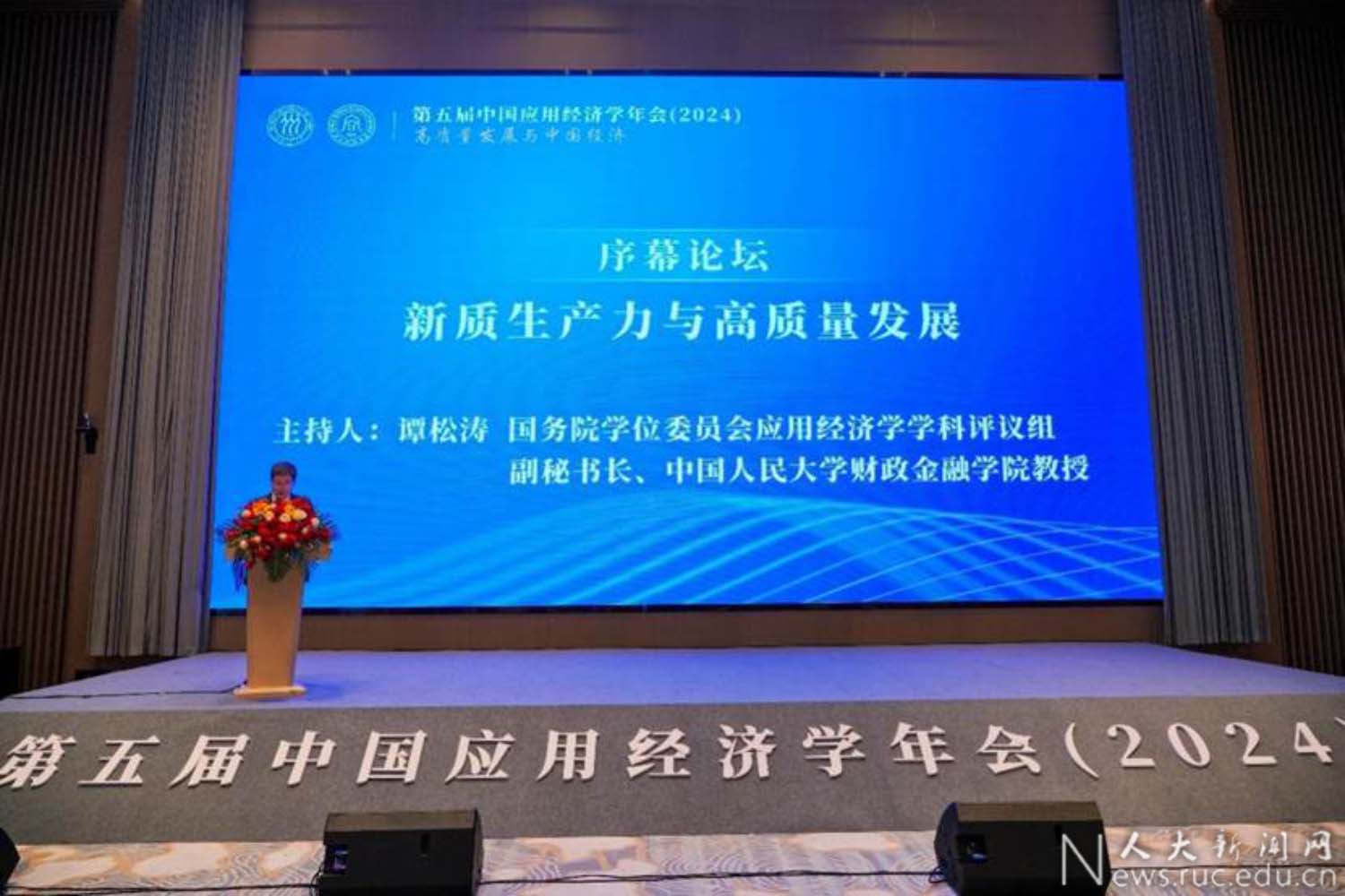 郑新业代表主办方中国人民大学对年会的召开表示祝贺。他表示本次大会以“高质量发展与中国经济”为主题,邀请应用经济学学科带头人交流研讨,协同创新、共谋发展,唱响中国经济光明论正当其时,意义重大。高校作为教育、科技、人才的集中交汇点,应在发展新质生产力中展现更大作为。他希望学界同仁立足中国国情,以服务中国式现代化为出发点,努力构建中国自主的应用经济学知识体系,推进新质生产力体系化和学理化研究,自觉以回答中国应用经济学的中国之问、世界之问、人民之问、时代之问为学术己任,为推进高质量发展、强国建设、民族复兴提供理论支撑和智力支持。
