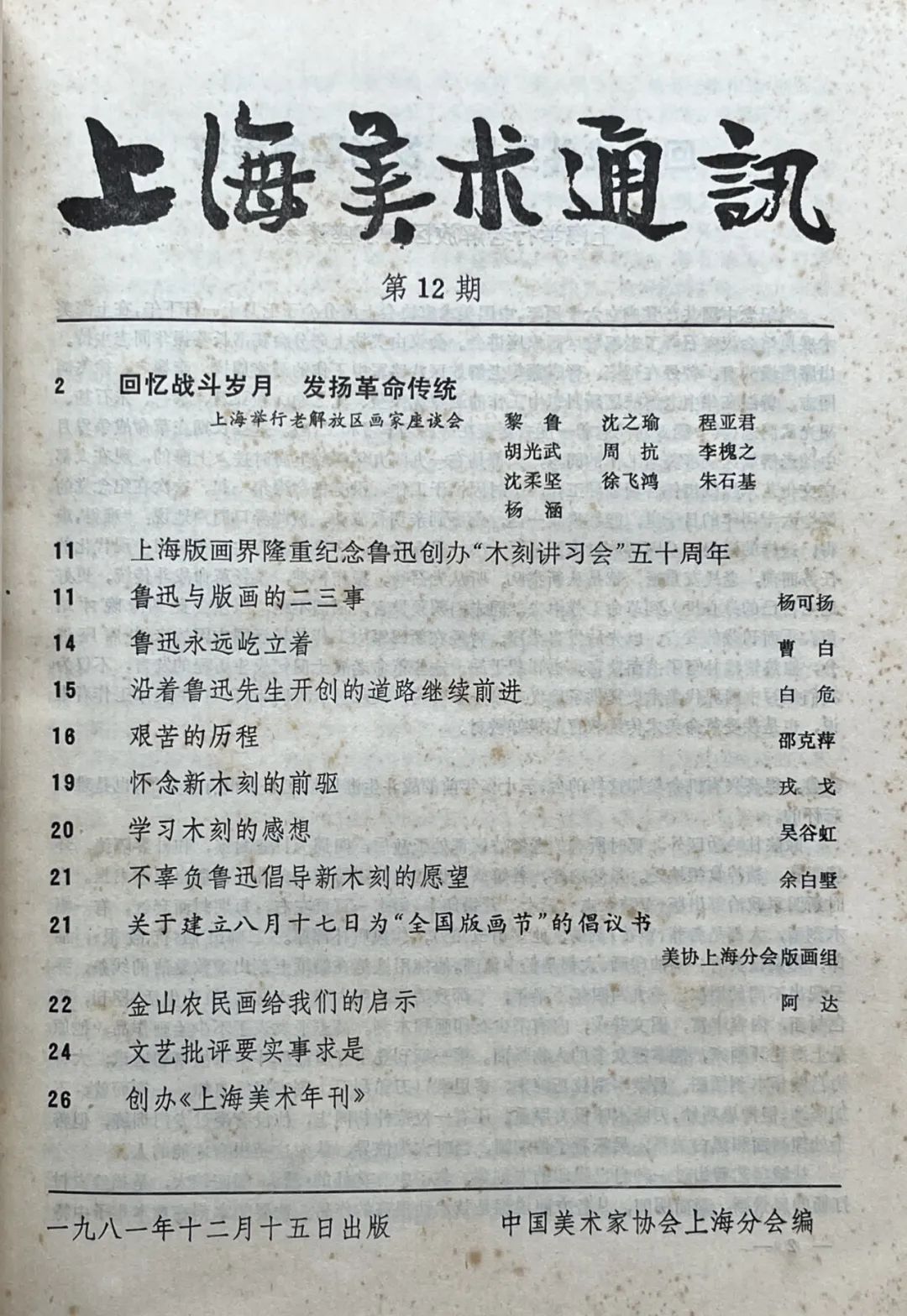 我是土生土长的上海人,始终怀着深深的乡愁在美协工作。在华东美协成立之后,我奉命由中共上海市委文化艺术工作部调入华东美协工作,直至移续到中国美协上海分会和上海美协,从事美术史论研究和学术活动的组织工作,出任理论研究室主任、理论委员会委员、美协理事,负责创刊和主编美协会刊《上海美术通讯》(现名《上海美术》)。