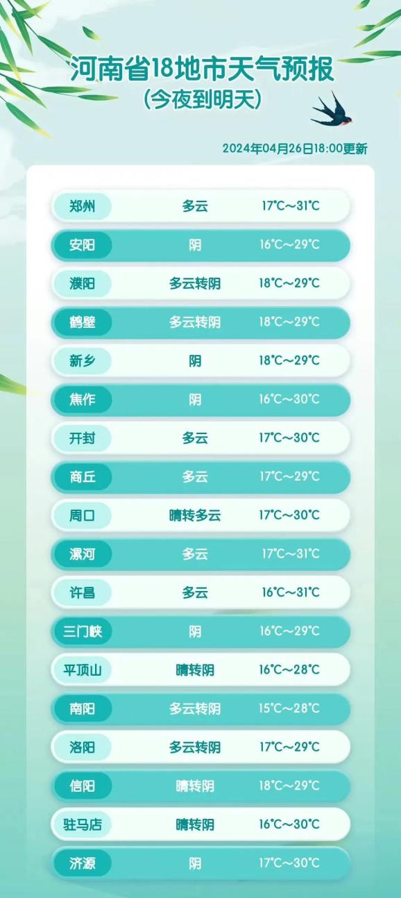 ●4月27日夜里至28日,河南黄河以南有一次对流性降水天气过程,南阳南部、信阳部分县市有中雨、局部大雨,并伴有雷暴大风、短时强降水等强对流天气。28日至30日,全省偏北风4到5级,阵风7级左右;29日至30日,北中部、南部部分县市还有分散性阵雨、雷阵雨。在雨水的影响下,明天起全省最高气温明显下降,全省最高气温下降6℃左右。