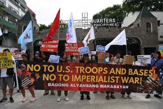 4月22日,菲律宾马尼拉,菲美军方启动2024年度“肩并肩”联合军事演习。许多菲律宾民众当天在马尼拉军事总部前抗议此次军演。视觉中国供图