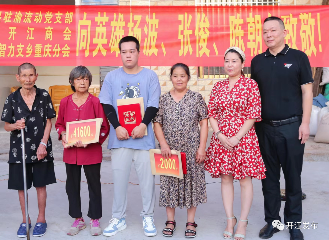 另据“开江发布”消息,8月22日,开江县委书记庞佑成、县长李文章率队赴任市镇开展见义勇为模范表彰慰问活动,看望慰问在重庆市嘉陵江勇救落水群众的见义勇为英雄杨波的亲属以及张俊、陈朝名(同行者,在岸边呼救并协助救援)。慰问期间,庞佑成为杨波(已逝,亲属代表代领)颁发了“开江好人”荣誉证书及奖励金5千元、抚恤金2万元、慰问金1万元。李文章、开江县委副书记何先如分别为张俊、陈朝名(人在外地,亲属代表代领)颁发了“开江好人”荣誉证书及奖励金5千元、慰问金2千元。重庆开江商会常务副会长、秘书长徐亚琴代表商会捐赠现金46600元。目前,开江县正积极为其申报“达州好人”。