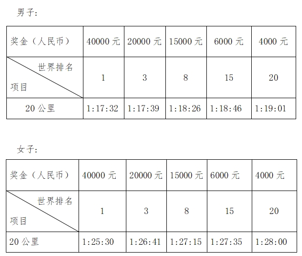 (三)马拉松竞走混合接力项目参赛队须由2名(1男1女)成年或青年运动员组成,按照男(11.195km)、女(10km)、男(10km)、女(11km)的顺序进行比赛。