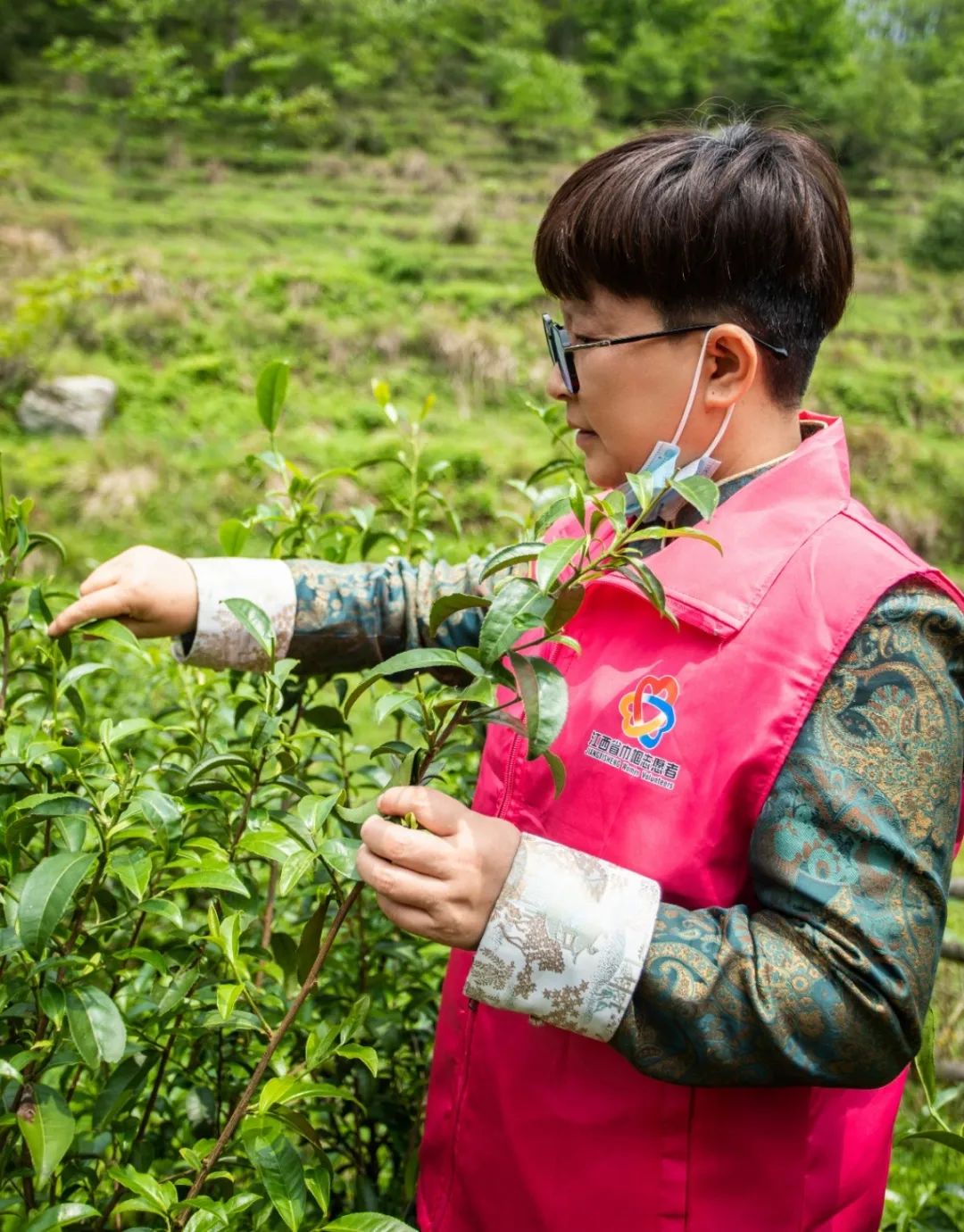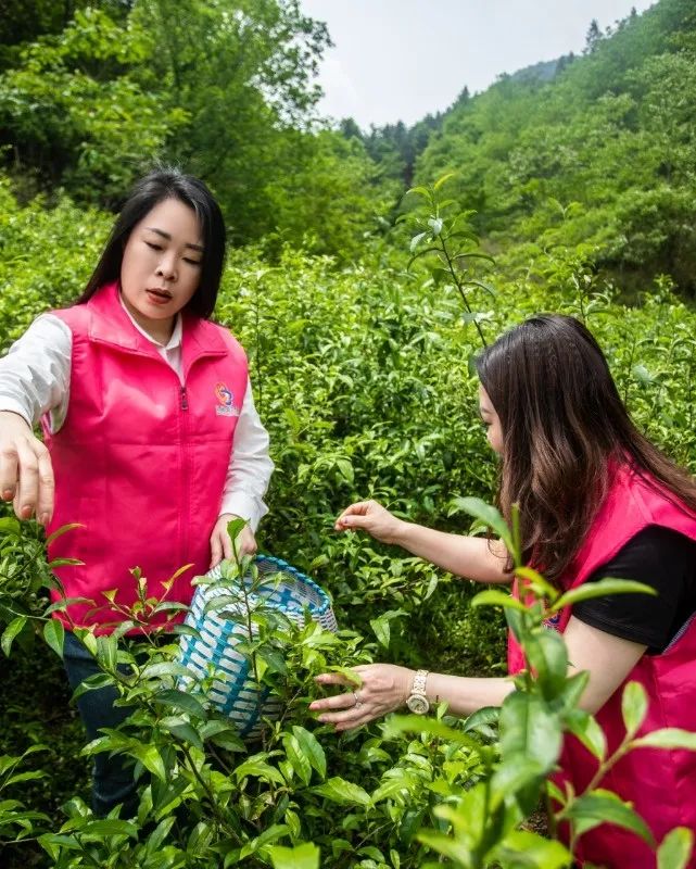 在认真学习采茶技术要求后,一抹抹巾帼红便拿着竹篓,三三两两来回奔忙于茶树丛中,开始帮助茶农采茶,“巾帼红”和“春茶绿”交相辉映,成了春日茶园里一道靓丽的风景线。