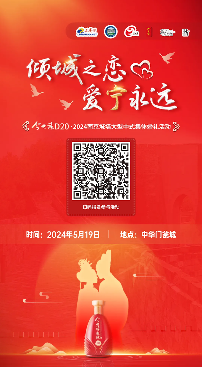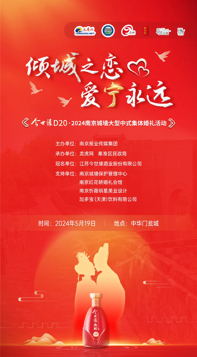 今年是南京明城墙肇建658周年,为提升公众对明城墙的认同感,增强公众对文化遗产的认知和保护传承意识,同时促进新时代婚俗文化的不断进步,由南京报业传媒集团主办,龙虎网、秦淮区民政局承办,今世缘酒业冠名,南京城墙保护管理中心提供支持的“倾城之恋 爱宁永远”——今世缘D20·2024南京城墙大型中式集体婚礼活动将于5月19日在南京明城墙的标志性城门——中华门举办。