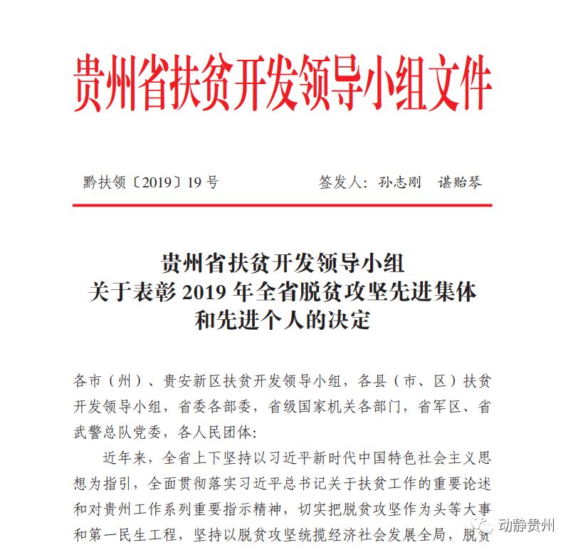 脱贫攻坚大浪淘沙、英雄辈出。在决战脱贫攻坚、决胜同步小康的奋斗历程中,全省广大党员干部群众、各行各业、社会各界共同付出了艰辛努力,涌现出一大批爱岗敬业、无私奉献、勇于创新、业绩突出的先进集体和先进个人。为弘扬先进,树立典型,凝聚脱贫攻坚正能量,激励全社会学习先进、赶超先进,形成关注扶贫、支持扶贫、参与扶贫的强大合力,推动按时打赢脱贫攻坚战。经省委、省政府同意,省扶贫开发领导小组决定授予贵阳市农业农垦投资发展集团有限公司等154个集体“贵州省脱贫攻坚先进集体”称号,授予罗应和等 267人“贵州省脱贫攻坚先进个人”称号。
