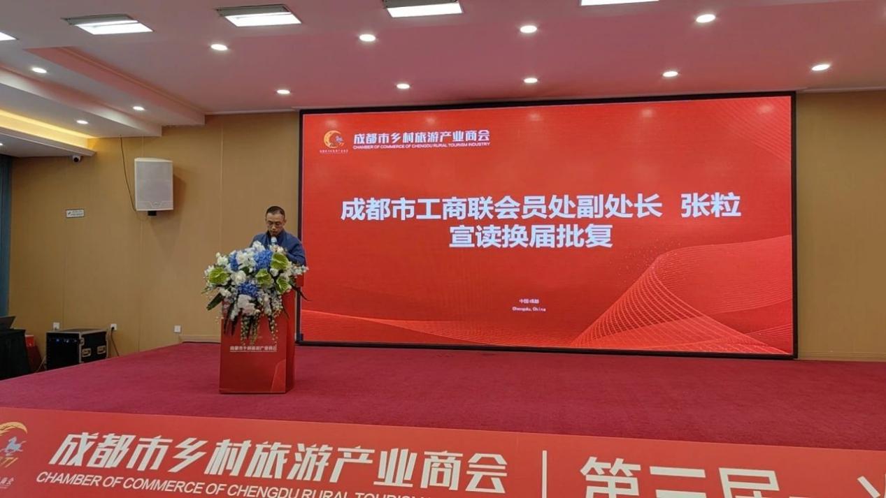 成都市工商联会员处副处长张粒宣读《关于同意成都市乡村旅游产业商会换届的批复》