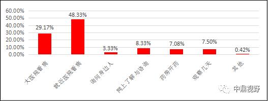 据数据反映,选择“大医院看病”的群众占29.17%,一定意义上说明接近1/3的群众发现身体不适时选择到大医院看病,这也是造成大医院看病人员扎堆严重的关键原因;选择“就近医院看病群众”接近一半,体现群众在身体不适时选择看病方式比较理智,避免延误病情,详见图1—6。