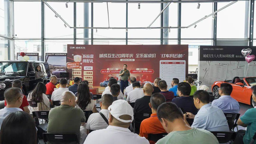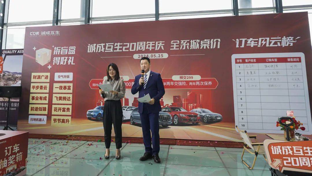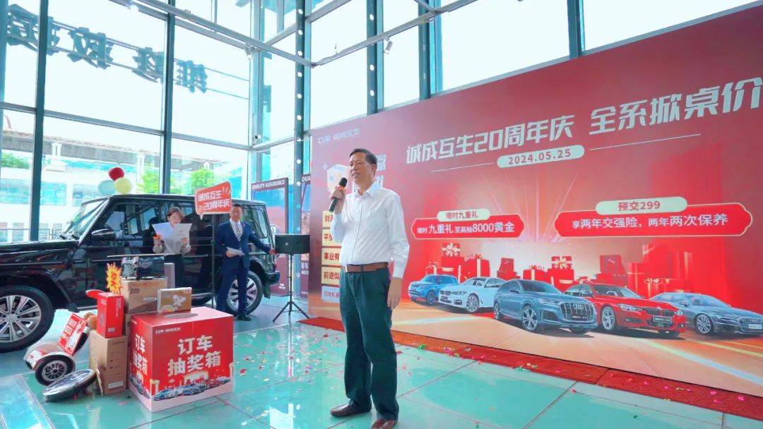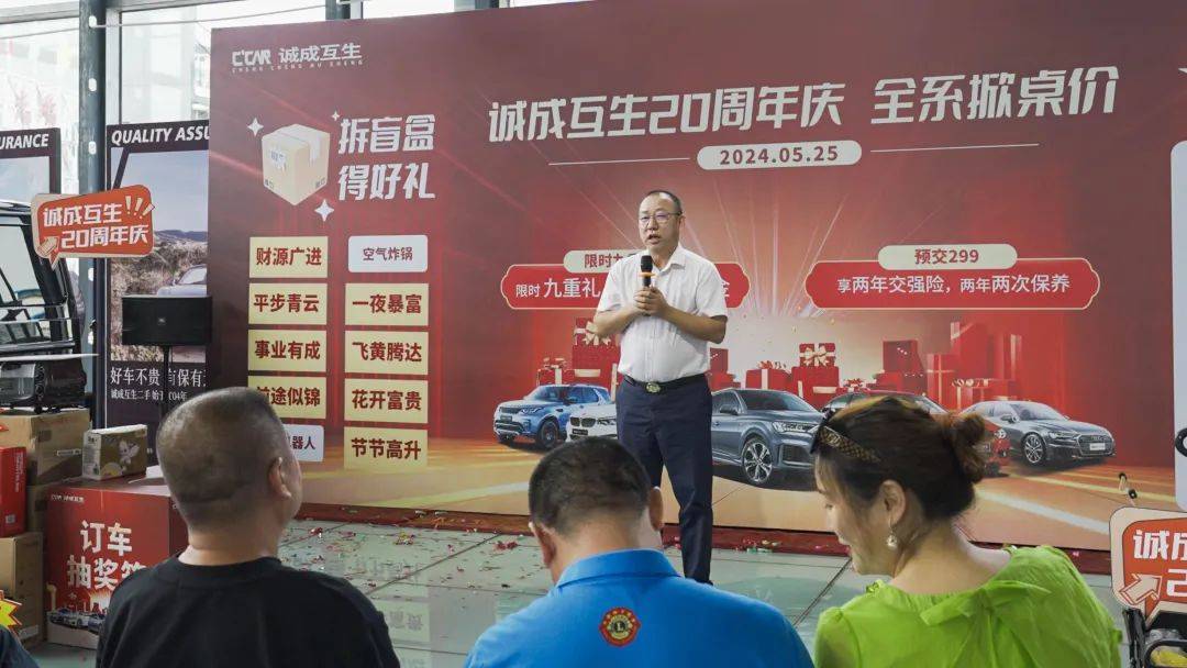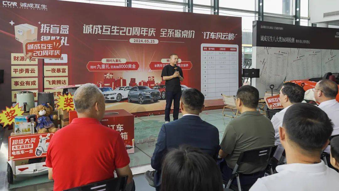 2024年5月25日为庆祝诚成互生二手车20周年庆,公司举办了一场诚挚又实惠的购车让利活动,本次活动以“诚成互生20周年庆-全系掀桌价”为主题,购车尊享九重大礼,以更优惠的价格,满足您的需求,还有现场购车抽奖的环节,100%中奖,还有终极大奖8000元黄金。
