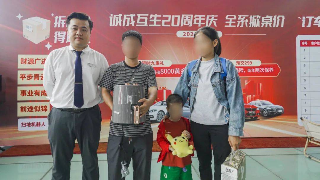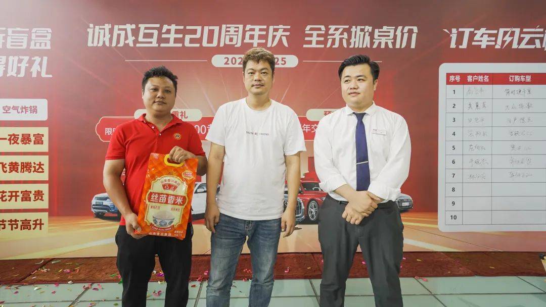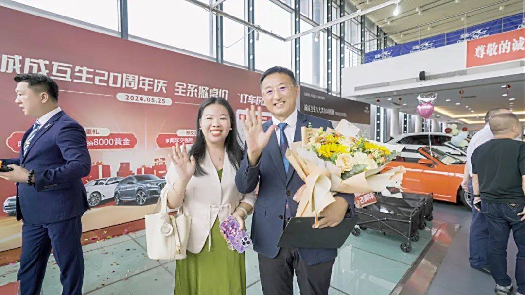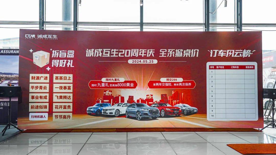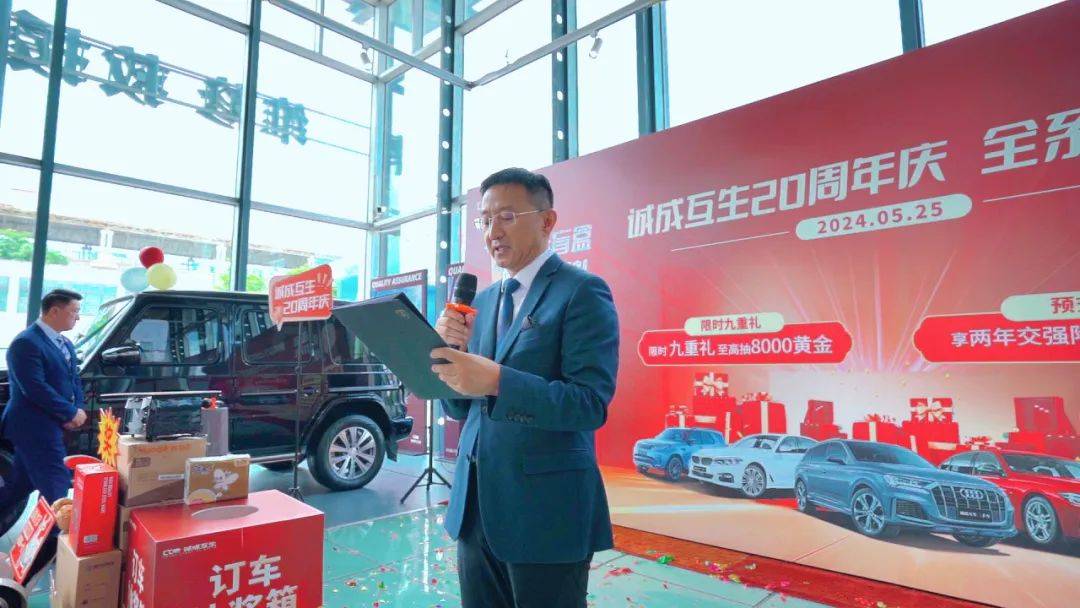 2024年5月25日为庆祝诚成互生二手车20周年庆,公司举办了一场诚挚又实惠的购车让利活动,本次活动以“诚成互生20周年庆-全系掀桌价”为主题,购车尊享九重大礼,以更优惠的价格,满足您的需求,还有现场购车抽奖的环节,100%中奖,还有终极大奖8000元黄金。