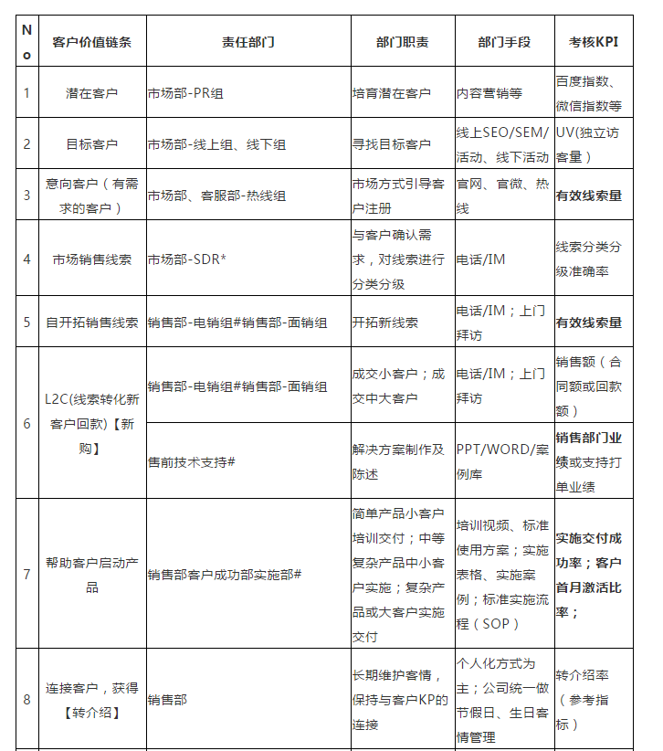 * 最重要的是,在客户价值链条上,从“新购”到“增购”、“续费”,包括“转介绍”,务必要有清晰的职责划分: