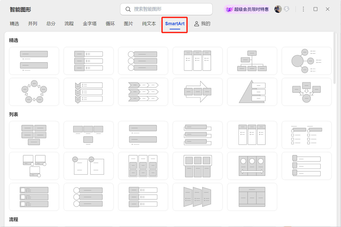 步骤二:在【SmartArt】页面下拉找到【层次结构】最后点击选中的模型