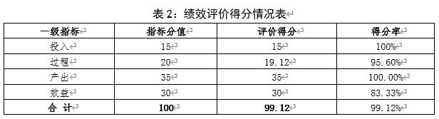 本项目绩效评价得分99.12分,评价等级为“优”。一级指标具体得分情况详见表2: