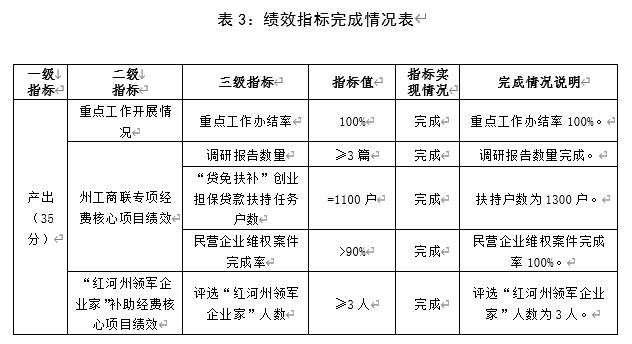 本次绩效评价结合部门整体支出情况,设置了4个一级指标(投入、过程、产出、效果);9个二级指标(目标设定、预算配置、预算执行、预算绩效管理、资产管理、重点工作开展情况、州工商联专项经费核心项目绩效、“红河州领军企业家”补助经费核心项目绩效、履职效益);33个三级指标。具体详见附件。