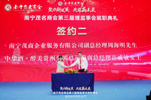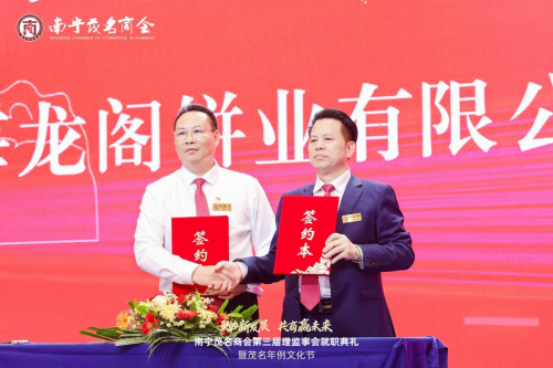 嘉宾们尽情享用美酒佳肴,欣赏精彩纷呈的文化大餐,参与激动人心的幸运大抽奖。同时,茂商战略合作签约仪式暨“茂品融桂”产品推荐会也在同步进行。签约的公司有:广东海龙阁饼业有限公司、中华酒·醉美贵州、南宁茂商企业服务有限公司、佛山市豪园饮料食品有限公司、广东葚之宝酒业有限公司等。我们共同见证了这激动人心的时刻,它将开启“茂品融桂”的新篇章。最后是颁发:支持商会建设特别贡献奖、支持商会建设突出贡献奖、关心商会建设奖等。在活动的最后,伴随着一首《朋友》大合唱中,南宁茂名商会第三届理监事会就职典礼暨茂名年例文化节圆满结束。南宁茂名商会将以全新的面貌,与企业家朋友们一起聚力新发展,共商赢未来,迎接新挑战,创造新辉煌!
