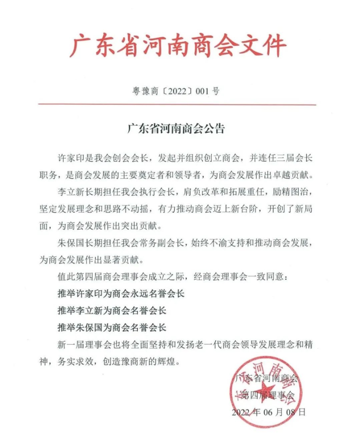 6月14日消息,广东省河南商会日前发文称,许家印是该会创会会长,发起并组织创立商会,并连任三届会长职务,是商会发展的主要奠定者和领导者,为商会发展作出卓越贡献。经商会理事会一致同意:推举许家印为商会永远名誉会长。