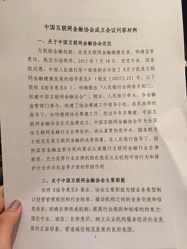 为鼓励金融创新,促进互联网金融健康发展,明确监管责任,规范市场秩序,2015年7月18日,经党中央、国务院同意,中国人民银行等十部委联合印发了《关于促进互联网金融健康发展的指导意见》(银发〔2015〕221号,以下简称《指导意见》),明确提出“人民银行会同有关部门,组建中国互联网金融协会”。随后,人民银行牵头,各金融监管部门参与,组建了协会筹建工作领导小组,在民政部的指导下,加快推进协会筹建工作。经过半年多筹建,中国互联网金融协会正式挂牌成立。中国互联网金融协会作为全国性互联网金融行业自律组织,将认真贯彻党中央、国务院关于规范发展互联网金融的决策部署,在人民银行指导下,按照国家金融监管法规的要求认真履行互联网金融行业自律职责,充分发挥行业自律机制在规范从业机构市场行为和保护行业合法权益等方面的积极作用。