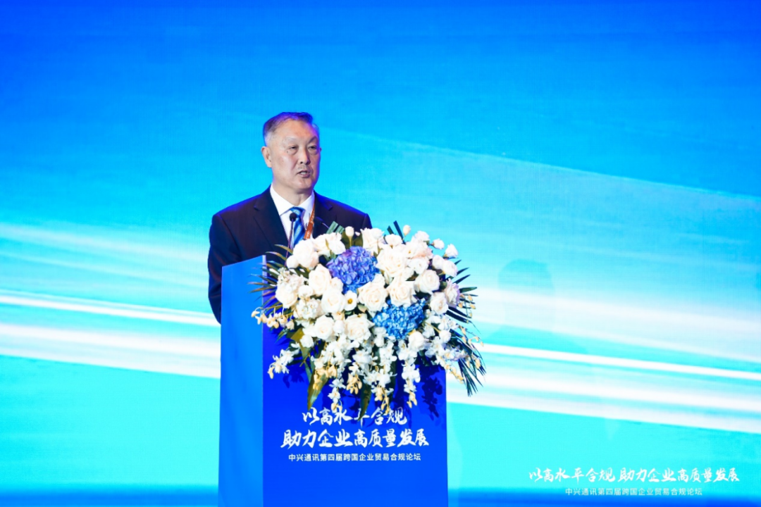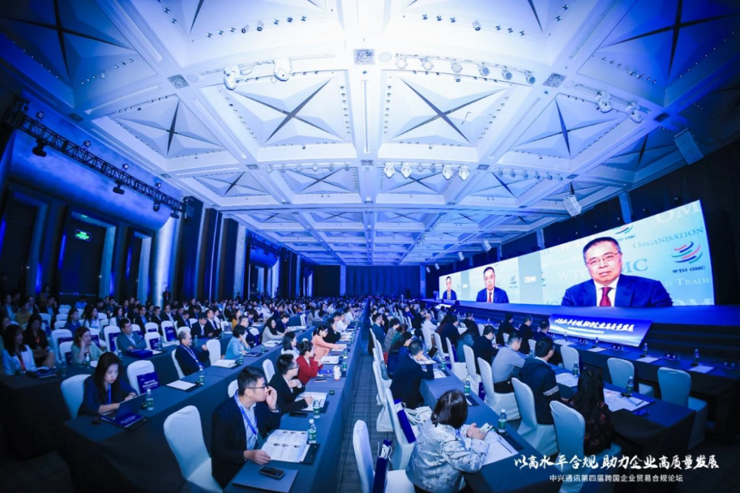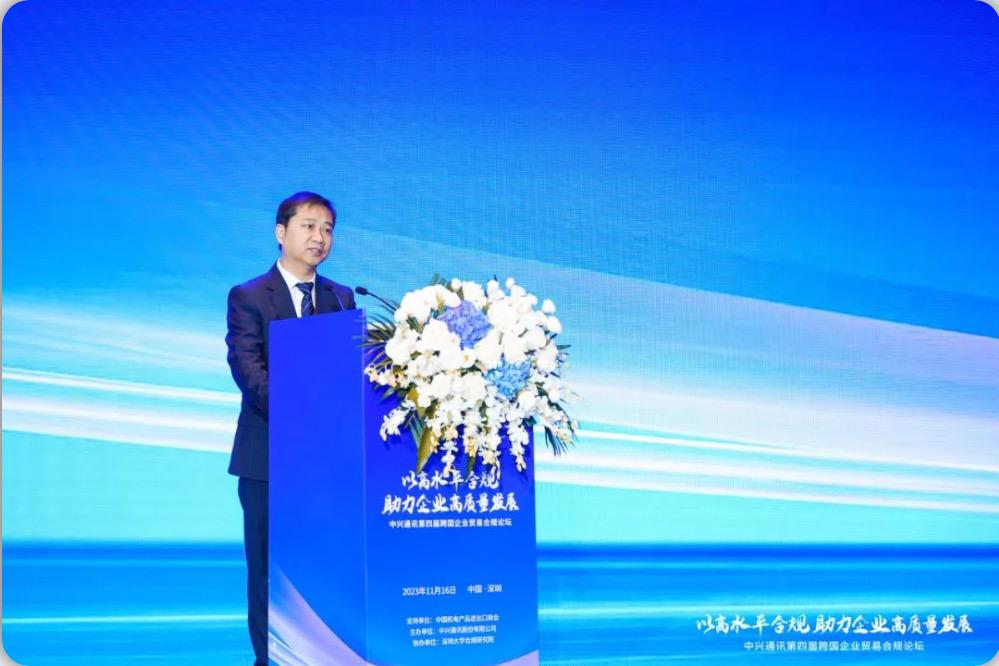 2023年11月16日,由中国机电产品进出口商会支持,中兴通讯股份有限公司主办,深圳大学合规研究院协办的中兴通讯第四届跨国企业贸易合规论坛在深圳成功举办。世界贸易组织副总干事张向晨,国务院国资委政策法规局局长林庆苗,中国机电产品进出口商会会长张钰晶,深圳市市场监督管理局党组成员、市场稽查局局长洪隽,中兴通讯执行副总裁、首席运营官谢峻石在开幕式上为论坛致辞。