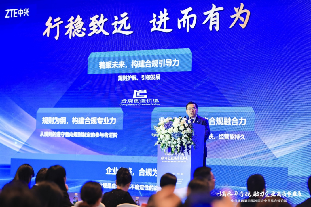 中兴通讯谢峻石执行副总裁在致辞中分享了中兴通讯在建设高水平合规的四点思考:第一,企业战略,合规为基,企业要保障合规战略性投入以应对不确定性;第二,以规则为纲,构建合规专业力,企业要从规则遵守者向运用者、制定参与者进阶,提升规则软实力;第三,以业务为纬,构建合规融合力,实现合规风险管得住、支撑业务跑得快、助力经营能持久;第四,着眼未来,构建合规引导力,企业对内要引导业务健康发展,对外参与规则制定并贡献企业力量。
