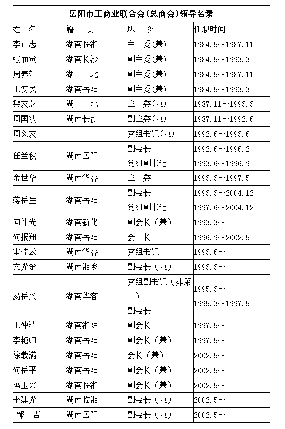 县工商联 中华人民共和国成立初期,各县在接管旧商会的基础上成立县工商联或工商联筹备委员会,在基层建立工商联组织或同业公会。1950年2月,湘阴县全面改组旧商会,城关镇19个同业公会组成城关镇工商联,并在樟树港、白马寺、临资口、南大膳、河灰塘、新市、泪罗、长乐、营田等集镇成立工商联,在较小集镇成立工商小组。6月,岳阳县城区成立工商联筹委会,组织城区工商业者按自然行业成立4个同业公会。12月,平江县工商联成立筹委会,下设接管、组织、辅导、财务、调解5个委员会,会址设旧商会原址,管辖36个行业,共有商户1492户;临湘县12个集镇成立工商联基层组织。1953年3月,岳阳县工商联成立,周养轩首任会长;临湘县工商联筹委会成立。4月,成立华容县工商联筹委会。7月,湘阴县各集镇成立工商联后,在城关成立湘阴县工商联筹备委员会。9月,平江县丁商联筹委会召开全县工商业代表大会,成立平江县工商联。1955年1月,湘阴、临湘分别召开县工商联第一次会员代表大会,正式成立县工商联,并分别选举产生第一届执委会。1957年3月。华容县工商联成立。至“文化大革命”前,岳阳、湘阴、临湘、华容、平江县分别召开3~5次会员代表大会。分别选举产生1~5届执委会。“文化大革命”期间,县工商联活动停止,机构撤销。1984年,各县(市)工商联筹建工作逐步展开。12月,临湘县召开县工商联第六届会员代表大会,重建临湘县工商联;湘阴县工商联筹备处召开有62名代表参加的会议,恢复湘阴县工商联。1985年2月,华容县成立县工商联筹委会,4 月,成立华容县工商联。3月,汨罗县召开首届工商业代表大会,成立泪罗县_I=商联。5月,平江县召开第五届工商联会员代表会议,恢复平江县工商联。8 月,恢复岳阳县工商联。之后,南、北、郊三区成立工商联组织。至1990年,各县(市)、区及钱粮湖农场、建新农场的工商联机构均建立健全,全市有同业公会3个,乡镇工商联组织29个,行业小组4个。还组建40个工商联乡镇分会,4个同业公会和10个行业协会。