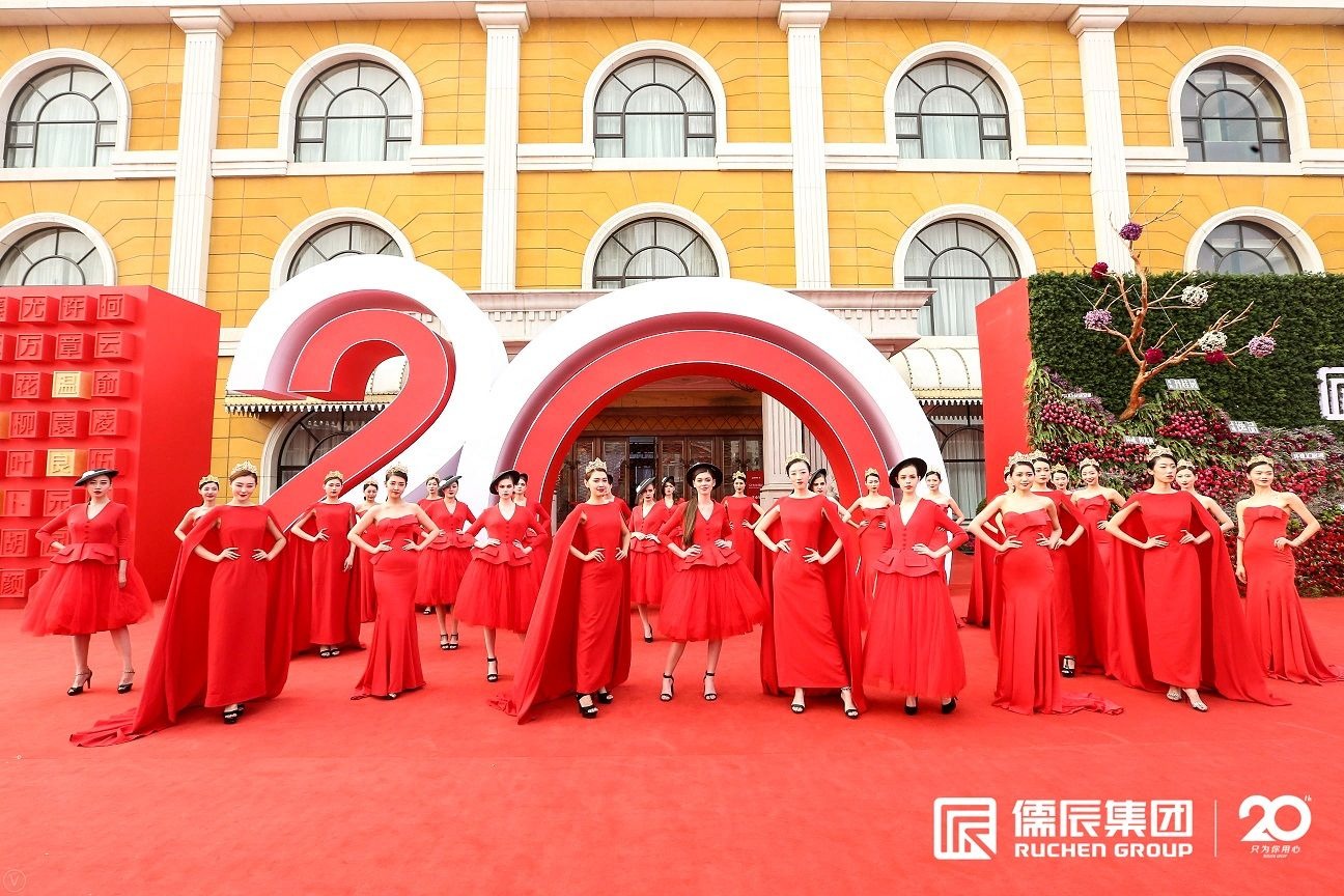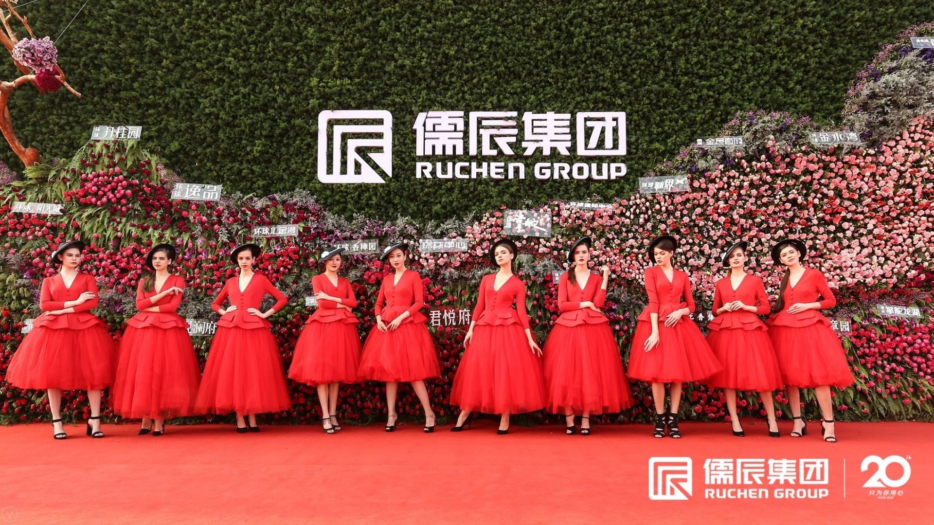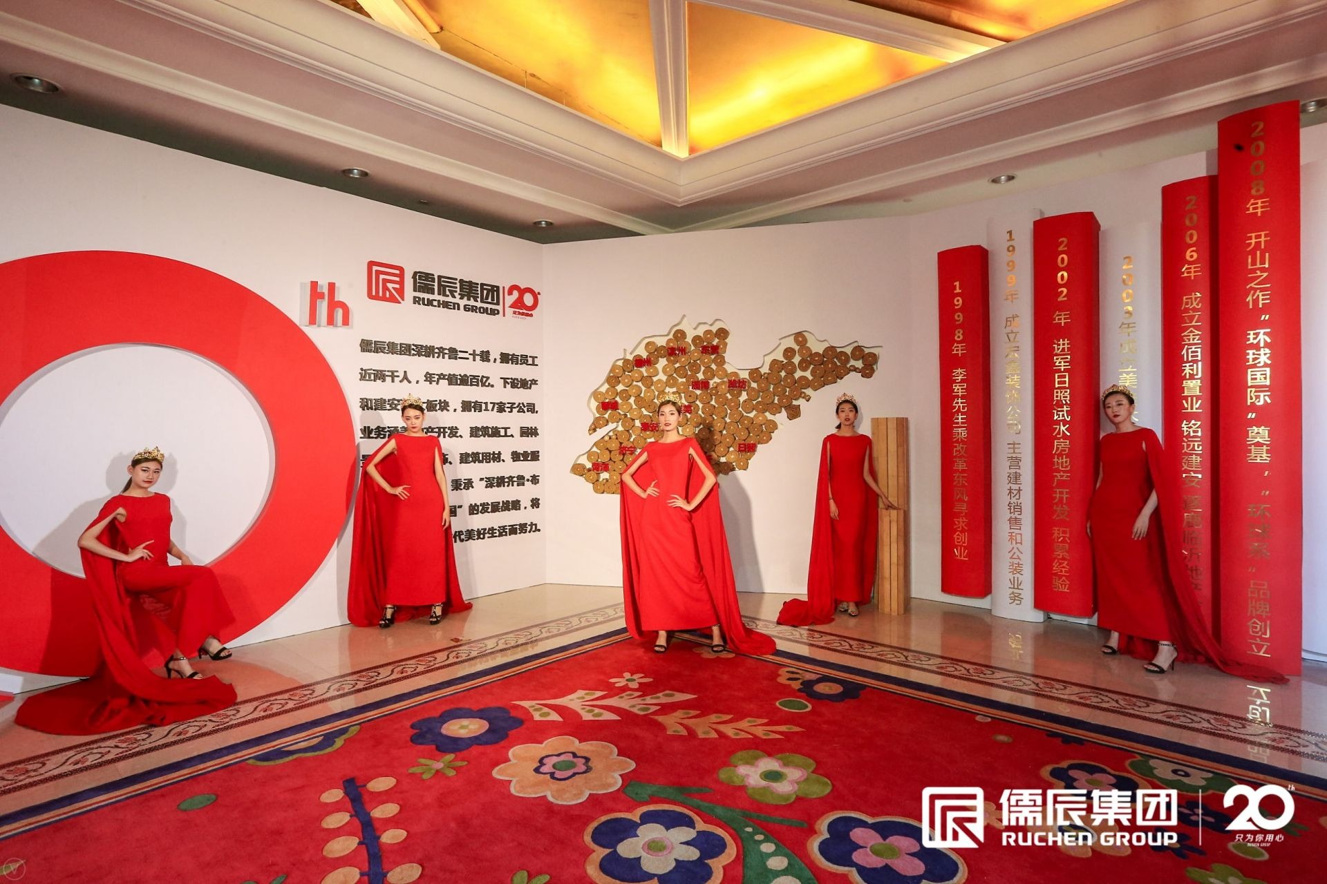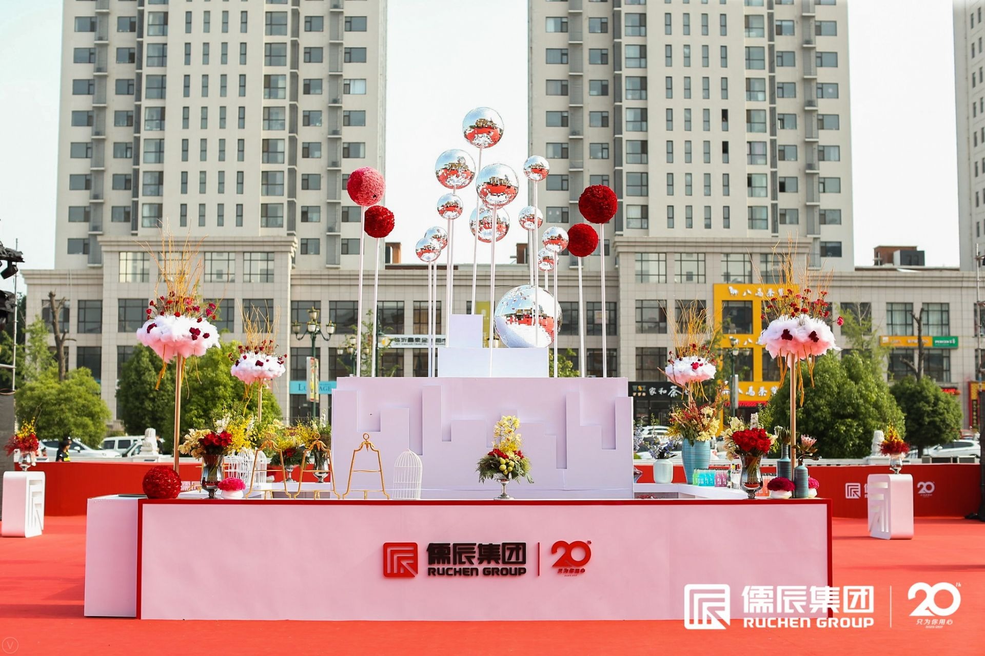 其中最有亮点的为外场主题侧面的儒辰全新logo展示墙,红金色的立体墙上,“儒辰集团 只为你用心”的立体字和儒辰集团最新logo,格外夺人眼球。集团项目集锦以鲜花墙形式呈现,一派盎然生机,“20”特装的立体通道,让20周年主题更加突出!