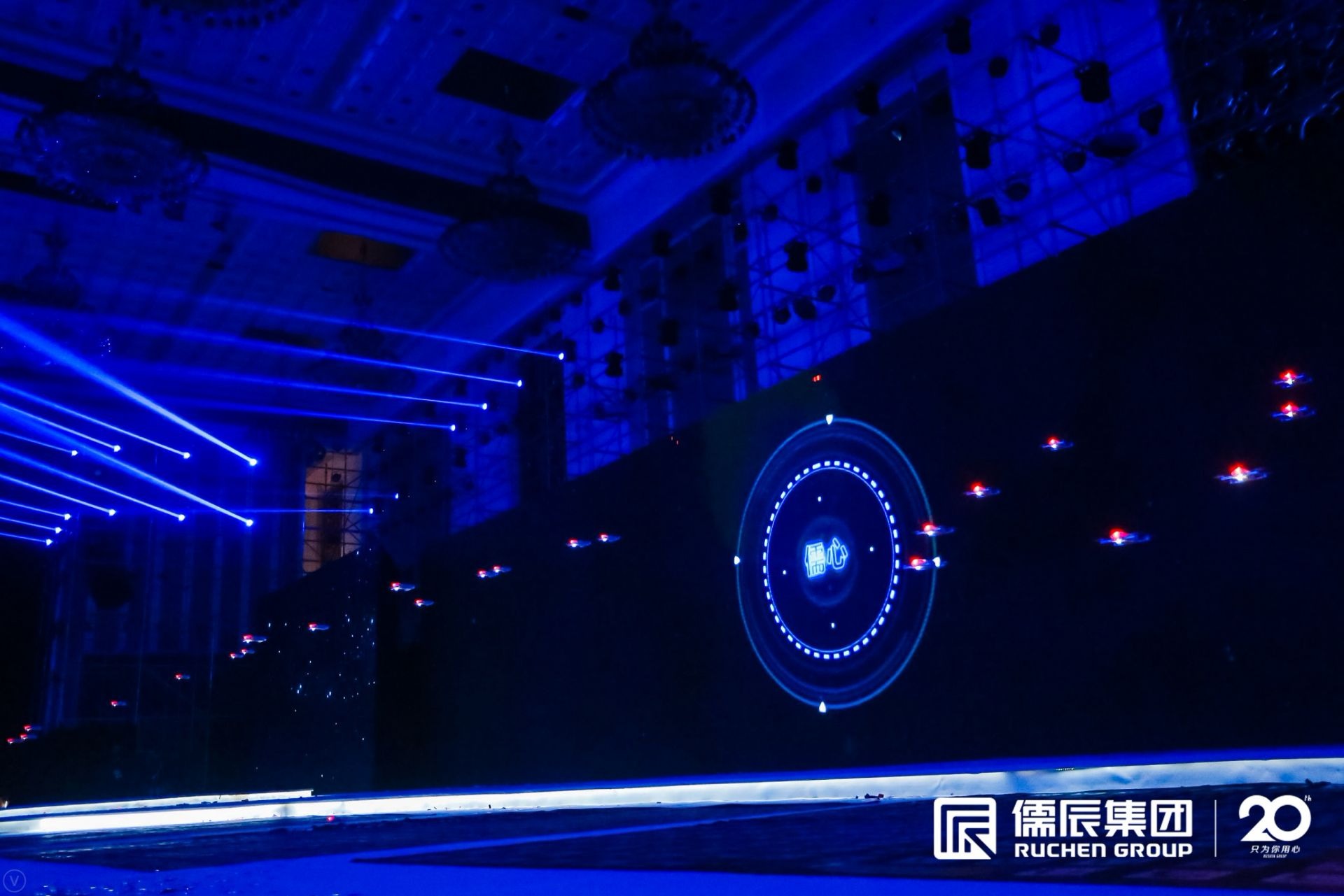 当天活动的最后,无人机灯光主题表演,以创新并充满科技感的形式重磅呈现儒辰集团全新logo,亮相2018。伴随着多架无人机在舞台上缓缓升起,璀璨灯光伴随科技呈现,变换灯光、排布,带来音乐、视频、投影和特效的完美配合。现场以无人机摆出“I ❤ U“的形状,寓意儒辰集团”只为你用心“的全新品牌理念。对于儒辰而言,坚信与时代同行,以智慧理念领航未来。