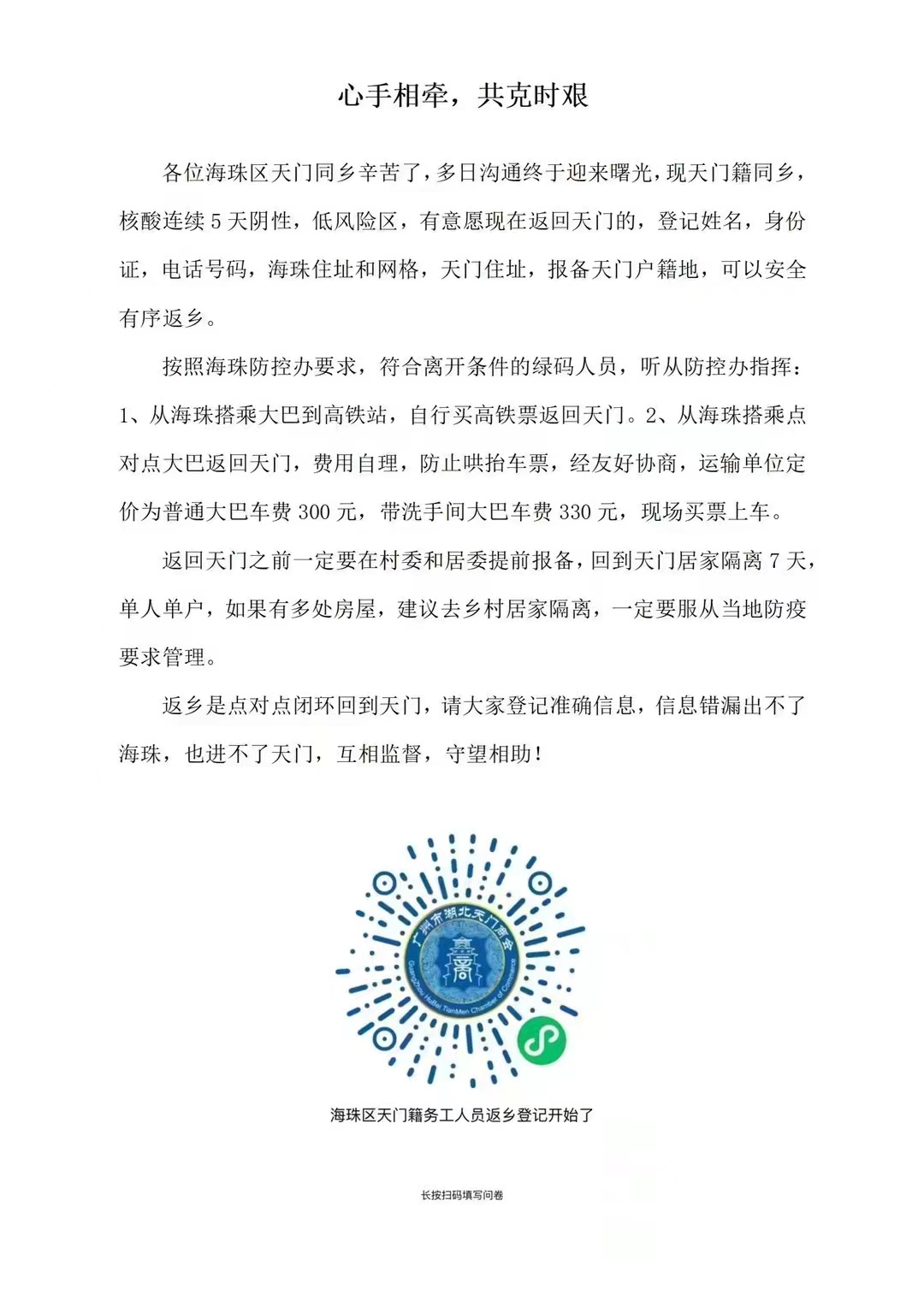 “按照海珠防控办要求,符合离开条件的绿码人员,听从防控办指挥,一方面可以从海珠搭乘大巴到高铁站,自行买高铁票返回天门;另一方面,可以从海珠搭乘点对点大巴返回天门,费用自理,防止哄抬车票,经友好协商,运输单位定价为普通大巴车费300元,带洗手间大巴车费330元,现场买票上车。”