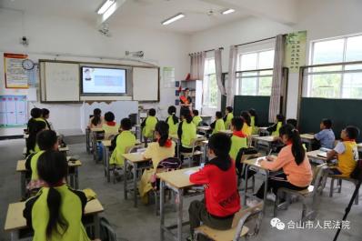 “同学们,你们知道明天即将有一个关于你们的新修订的法律要实施吗?”5月31日上午,在合山市东矿小学法治课堂上,合山法院韦法官正用通俗易懂的语言及灵活的互动方式,给孩子们普及法律常识。