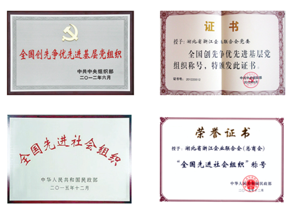 商会多次荣获国家和省市各级荣誉。2012年,中组部授予商会党委“全国创先争优先进基层党组织”荣誉称号;2015年,民政部授予商会“全国先进社会组织”荣誉称号;2019年、2021年、2022年,全国工商联连续三次授予商会“全国‘四好’商会”荣誉称号。2020年11月,浙江省委、省政府授予商会“浙江省抗击新冠肺炎疫情先进集体”荣誉称号。2020年11月,全国工商联授予商会“抗击新冠肺炎疫情先进商会组织”荣誉称号。2010年,湖北省人民政府授予商会“先进商会”荣誉称号。还先后荣获了湖北省民政厅授予的“积极参与精准扶贫先进单位”、湖北省工商联授予的“商会改革示范点”“参与湖北抗击新冠肺炎疫情的突出贡献单位”、浙江省工商联授予的“品牌商会”“优秀商会”、浙商总会授予的“战疫调度资源物资保障先锋”等荣誉称号。