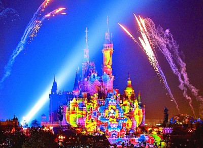 位于上海浦东的迪士尼乐园在进行焰火灯光秀表演。新华社发