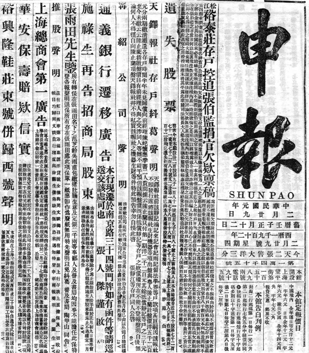 1912年2月29日《申报》刊登“上海总商会第一广告”,宣告上海商务总会与上海商务公所正式合并成立上海总商会。