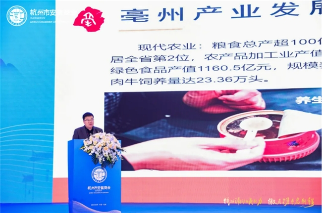 第二阶段,举办第二届徽商西湖讲坛。讲坛伊始,亳州市人民政府副市长薛冰作亳州市情推介,他说道,杭州市安徽商会作为浙皖沟通桥梁,始终心系家乡发展,在此诚挚邀请各位徽商企业家来亳考察,希望未来能进一步深化两市合作友谊关系,推动相关事项对接,不断强化项目牵引、机制创新,共同助力浙皖高质量发展。