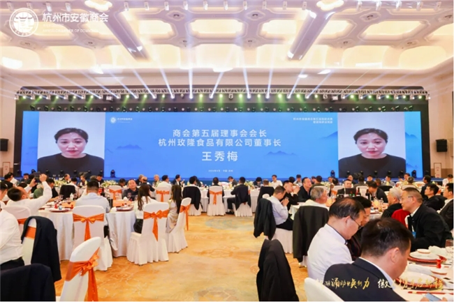 杭州市安徽商会第五届理事会会长、杭州玫隆食品有限公司创始人王秀梅因突发状况未到现场,通过一段VCR发表了感人的讲话。她回顾到,杭州市安徽商会在各级领导和社会各界人士的关心、支持与帮助下,运作规范、求真务实、争先创优、勇立潮头,始终致力于凝聚广大在杭徽商,创新优化服务举措,增进浙皖两地交流,打造一个思想互鉴、学习互促、资源互享、团结互助的温暖平台。她说道,感谢大家对我的信任与支持,选举我连任第五届理事会会长,让我深感荣幸,同时也倍感肩负的责任重大,希望各位会员能够持续深化徽商坚韧团结、诚实守信、团结互助、回馈社会等精神内核,不忘初心,抱团发展,立足主业做精做强做实,带领企业做强做大做久,共同促进企业和商会不断实现高质量发展。同时,王会长恳请各位领导、各位嘉宾、各位会员能够继续关心和支持杭州市安徽商会,在过去四届的基础之上实现新的发展。