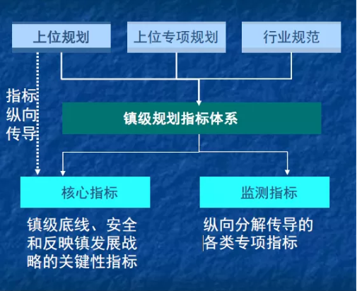 根据上位规划、专项规划和行业规范传导形成乡镇级规划指标体系。指标的构成应延续上位规划指标,进行深化落实,形成核心指标和监测指标。其中,核心指标应把控乡镇级底线、安全和反映乡镇发展战略的关键性指标;监测指标应纵向分解传导的各类专项指标,落实深化监测单元。
