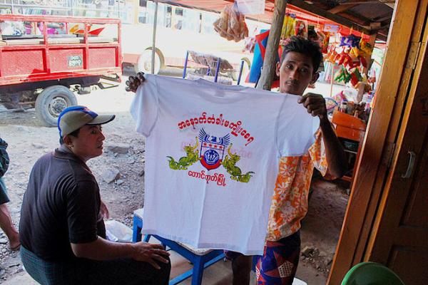 缅甸若开邦,一小伙子向我展示一件T恤,上面印有反NGO标语,他们正在准备一次反NGO的游行。(摄影:朱诺)