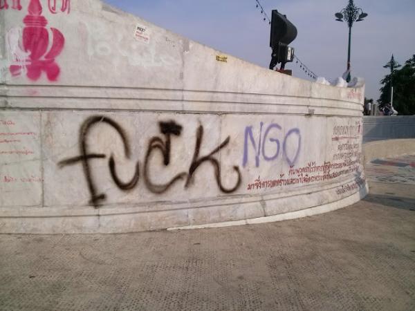 缅甸人涂抹标语发泄对支持罗兴亚人的NGO组织的不满。