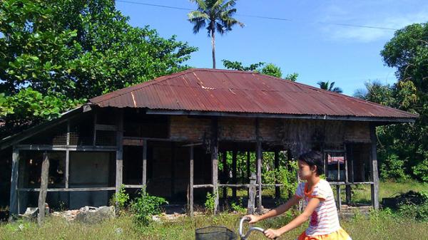 缅甸若开邦,一小女孩骑车从被烧毁的穆斯林屋子前经过。(摄影:朱诺)